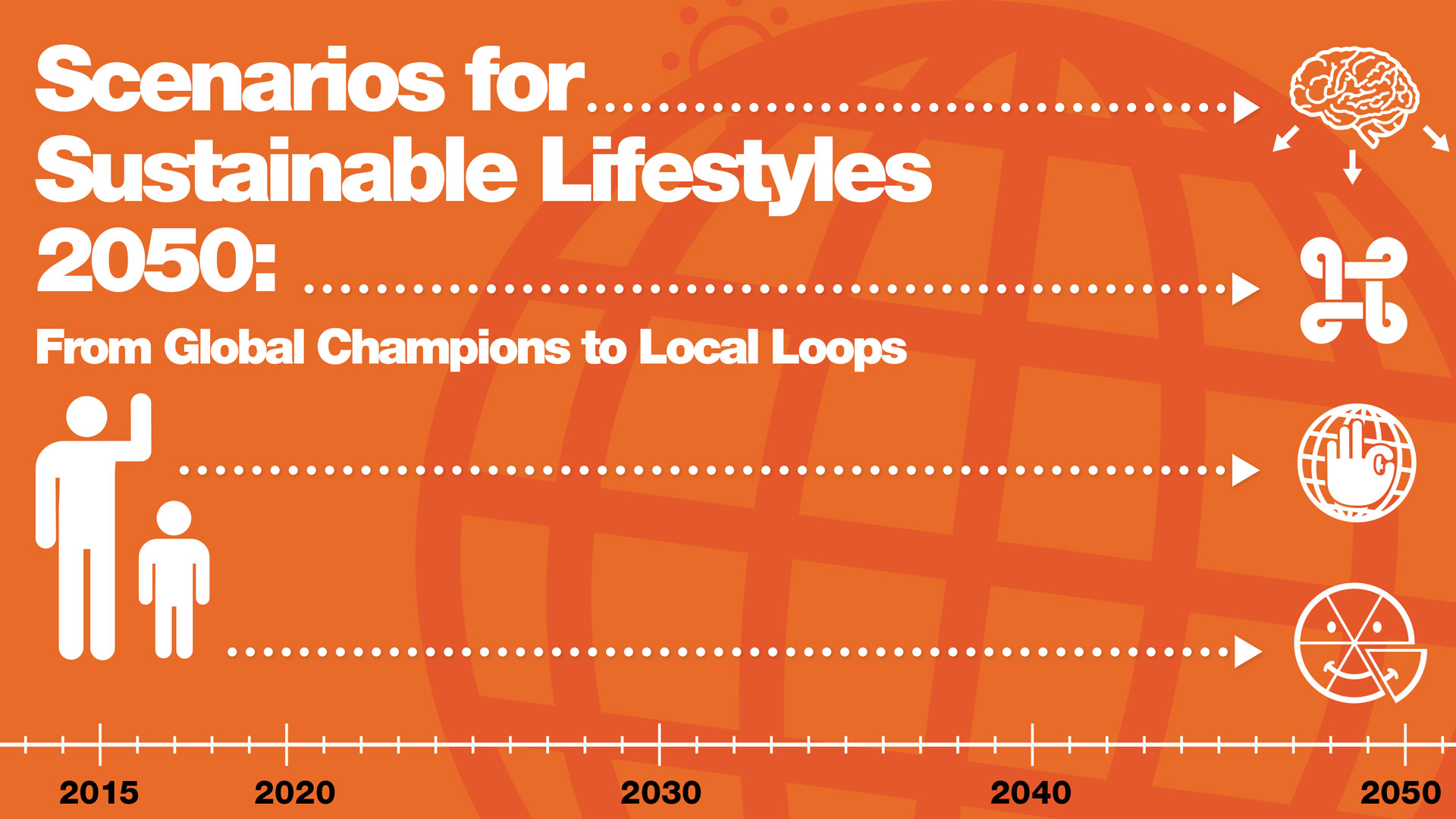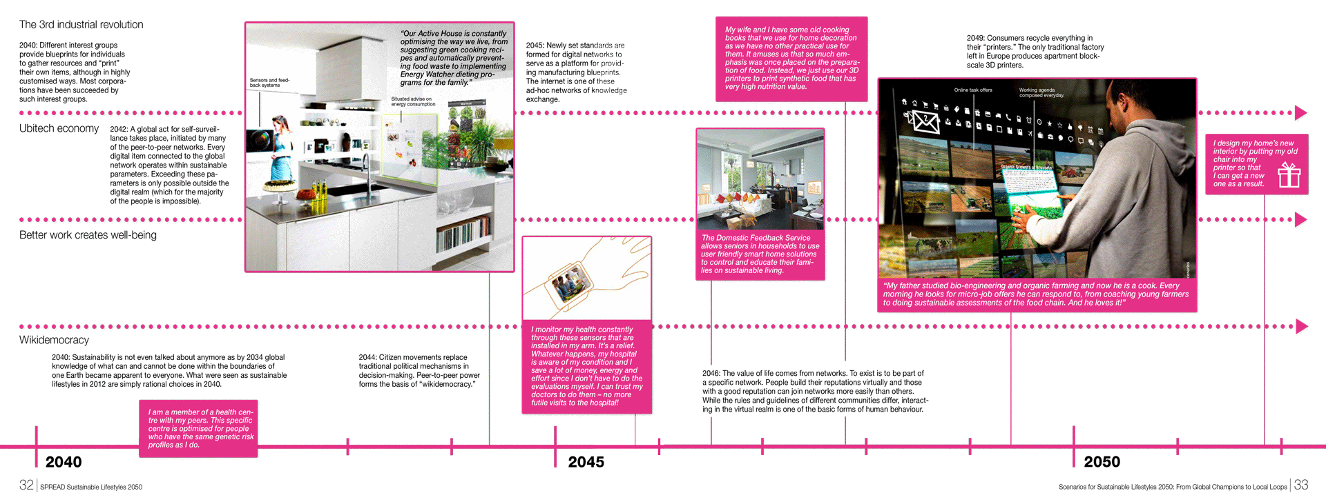 One of the key outcomes of the SPREAD project was the futures report Scenarios for Sustainable Lifestyles 2050: From Global Champions to Local Loops (Leppänen et al. 2012). The scenarios were presented as visual timelines that traced not only major political, technological and economic developments, but also everyday snapshots of how people might actually live in more sustainable societies. They aimed to show what the transition could feel like – on the scale of daily life as well as global change.